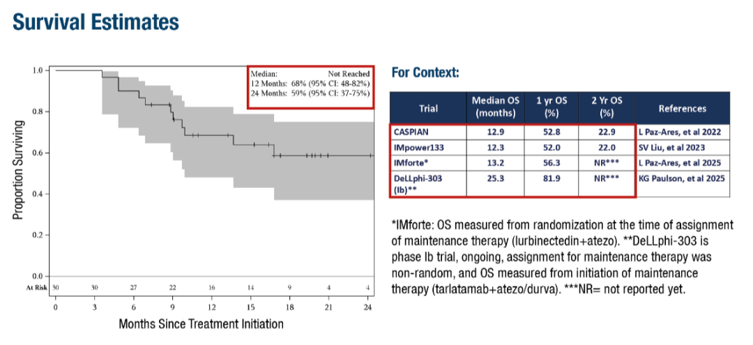 图:研究表明,广泛期小细胞肺癌患者接受ceralasertib联合度伐利尤单抗维持治疗后显示出生存获益(2025 ESMO,摘要号2761O)
